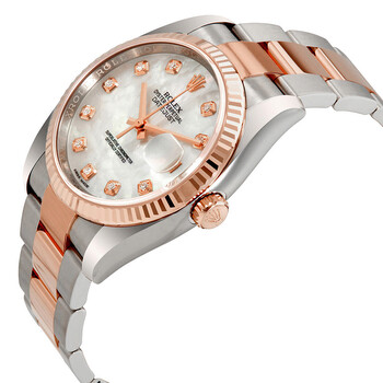 Silver-tone stainless steel case with a two-tone (silver-tone and gold-tone) stainless steel and 18kt everose gold rolex oyster bracelet. Fixed fluted 18kt everose gold bezel. Mother of pearl dial with rose gold-tone hands and diamond hour markers. Dial Type: Analog. Luminescent round. Date display at the 3 o'clock position. Rolex Calibre 3135 Automatic movement, containing 31 Jewels, bitting at 28800 vph, and has a power reserve of approximately 48 hours. Scratch resistant sapphire crystal. Screw down crown. Solid case back. Round case shape, case size: 36 mm. Oysterlock clasp. Water resistant at 100 meters / 330 feet. Functions: date, hour, minute, second. Datejust 36 Series. Luxury watch style. Watch label: Swiss Made. Item Variations: 116231-72601. Rolex Oyster Perpetual Datejust Mother of Pearl Diamond Men's Watch 116231MDO.