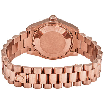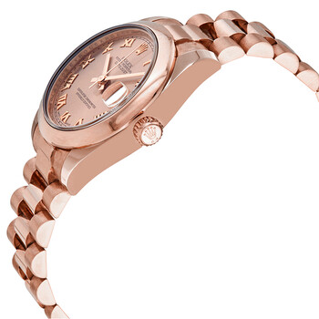 18 carat everose gold case with a 18 carat everose gold president bracelet. Domed bezel. Pink dial with rose gold-tone hands and Roman numeral hour markers. Dial Type: Analog. Date display at the 3 o'clock position. Rolex Calibre 2235 automatic movement. Scratch resistant sapphire crystal. Screw down crown. Solid case back. Case size: 31 mm. Round case shape. Concealed folding crown clasp. Water resistant at 100 meters / 330 feet. Functions: date, hour, minute, second. Luxury watch style. Watch label: Swiss Made. Rolex Oyster Perpetual Datejust Pink Dial Automatic Ladies 18 Carat Everose Gold Watch 178245PKRP.