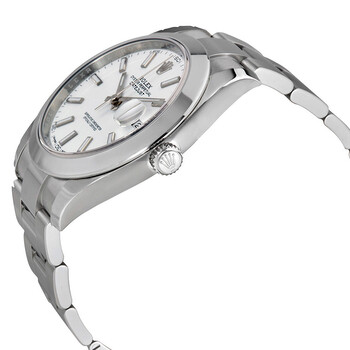 Stainless steel case with a stainless steel Rolex oyster bracelet. Fixed smooth stainless steel bezel. White dial with luminous silver-tone hands and index hour markers. Arabic numeral minute markers (at 5 minute intervals). Minute markers around the outer rim. Dial Type: Analog. Luminescent hands and markers. Date display at the 3 o'clock position. Rolex calibre 3235 automatic movement, based upon Rolex 3035, containing 31 Jewels, bitting at 28800 vph, and has a power reserve of approximately 70 hours. Scratch resistant sapphire crystal. Screw down crown. Solid case back. Round case shape. Case size: 41 mm. Fold over clasp with a safety release. Water resistant at 100 meters / 330 feet. Functions: date, hour, minute, second. Oyster Perpetual Datejust Series. Dress watch style. Watch label: Swiss Made. Rolex Oyster Perpetual Datejust White Dial Automatic Men's Watch 126300WSO.