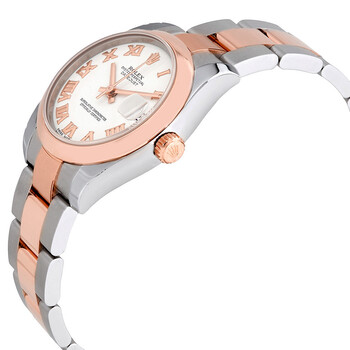 Stainless steel and 18 carat everose gold case with a stainless steel and 18 carat everose gold rolex oy bracelet. Domed bezel. White dial with rose gold-tone hands and Roman numeral hour markers. Dial Type: Analog. Date display at the 3 o'clock position. Rolex Calibre 2235 automatic movement. Scratch resistant sapphire crystal. Screw down crown. Solid case back. Case size: 31 mm. Round case shape. Folding oysterclasp clasp. Water resistant at 100 meters / 330 feet. Functions: date, hour, minute, second. Luxury watch style. Watch label: Swiss Made. Rolex Oyster Perpetual Datejust White Dial Automatic Stainless Steel and 18 Carat Everose Gold Ladies Watch.