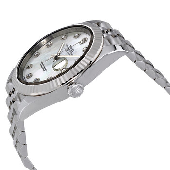 Stainless steel case with a stainless steel Rolex jubilee bracelet. Fluted 18kt white gold bezel. White mother of pearl dial with silver-tone hands and diamonds hour markers. Dial Type: Analog. Date display at the 3 o'clock position. Rolex calibre 3235 automatic movement with a 70-hour power reserve. Scratch resistant sapphire crystal. Screw down crown. Solid case back. Case size: 41 mm. Round case shape. Oysterlock clasp. Water resistant at 100 meters / 330 feet. Functions: date, hour, minute, second. Luxury watch style. Watch label: Swiss Made. Rolex Oyster Perpetual Datejust White Mother Of Pearl Diamond Dial Men's Watch 126334MDJ.
