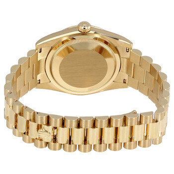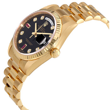 18kt yellow gold case with a 18kt yellow gold rolex president bracelet. Fluted 18kt yellow gold bezel. Black dial with gold-tone hands and diamond and ruby hour markers. Dial Type: Analog. Date display at 3 o'clock; day display at 12 o'clock. Rolex Calibre 3155 automatic movement with a 48-hour power reserve. Scratch resistant sapphire crystal. Screw down crown. Solid case back. Case size: 36 mm. Round case shape. Fold over crown clasp. Water resistant at 100 meters / 330 feet. Functions: date, day, hour, minute, second, chronometer. Luxury watch style. Watch label: Swiss Made. Rolex Oyster Perpetual Day-Date Automatic Men's 18 Carat Yellow Gold President Watch 118238BKDRP.