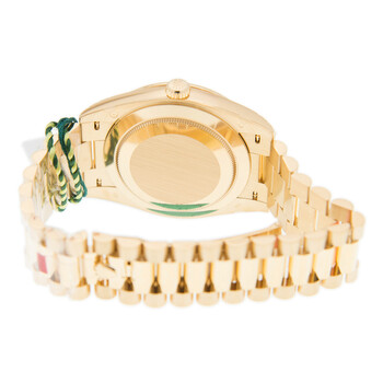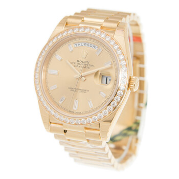 18kt yellow gold case with a 18kt yellow gold President bracelet. Fixed 18kt yellow gold bezel set with diamonds. Champagne dial with yellow gold-tone hands and baguette diamond hour markers. Minute markers around the outer rim. Dial Type: Analog. Date display at the 3 o'clock position. Day of the week display centered on the 12 o'clock position. Rolex calibre 3255 automatic movement with a 70-hour power reserve. Scratch resistant sapphire crystal. Screw down crown. Solid case back. Round case shape. Case size: 40 mm. Concealed crown clasp. Water resistant at 100 meters / 330 feet. Functions: date, day, hour, minute, second, chronometer. Luxury watch style. Watch label: Swiss Made. Rolex Oyster Perpetual Day-Date Champagne Diamond Dial 18K Yellow Gold Men's Watch 228348CDP.
