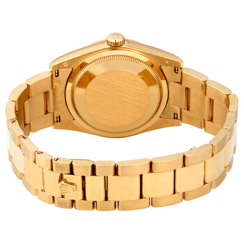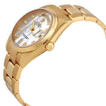 18 carat yellow gold case with a 18 carat yellow gold oyster bracelet. Fixed- domed bezel. Mother of pearl dial with gold-tone hands and diamond hour markers. Dial Type: Analog. Date display at the 3 o'clock position and day display at the 12 o'clock position. Rolex Calibre 3155 automatic movement with about 48 hours of power reserve. Scratch resistant sapphire crystal. Screw down crown. Solid case back. Case size: 36 mm. Round case shape. Oyster clasp. Water resistant at 100 meters / 330 feet. Functions: date, day, hour, minute, second, chronometer. Casual watch style. Watch label: Swiss Made. Rolex Oyster Perpetual Day-Date Mother of Pearl Dial Automatic Ladies 18 Carat Yellow Gold Oyster Watch 118208MDO.