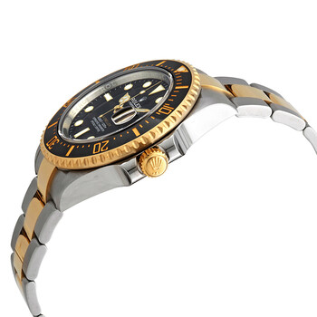 Stainless steel case with a oystersteel bracelet with 18kt yellow gold center links. Uni-directional rotating yellow gold bezel with black cerachrom fill. Black dial with luminous yellow gold-tone hands and dot hour markers. Minute markers around the outer rim. Dial Type: Analog. Luminescent hands and markers. Date display at the 3 o'clock position. Rolex calibre 3235 automatic movement with a 70-hour power reserve. Scratch resistant sapphire crystal. Screw down crown. Solid case back. Round case shape. Case size: 43 mm. Fold over clasp with a safety release. Water resistant at 1220 meters / 4000 feet. Functions: date, hour, minute, second, chronometer. Luxury watch style. Watch label: Swiss Made. Item Variations: 126603-0001, M126603-001, 126603. Rolex Sea-Dweller Automatic Chronometer Oystersteel and Yellow Gold Watch 126603BKSO.