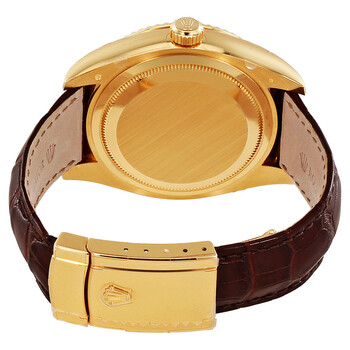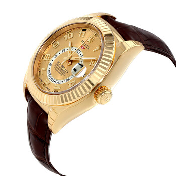 18kt yellow gold case with a brown leather strap. Bi-directional rotating fluted ring command 18kt yellow gold bezel. Champagne dial with luminous gold-tone hands and Arabic numeral hour markers. Minute markers around the outer rim. Dial Type: Analog. Date display at the 3 o'clock position. One - 24 hour subdial. Rolex Calibre 9001 automatic movement with a 72-hour power reserve. Scratch resistant sapphire crystal. Screw down crown. Solid case back. Round case shape. Case size: 42 mm. Oyster lock clasp. Water resistant at 100 meters / 330 feet. Functions: annual calendar, GMT, second time zone, month, date, hour, minute, second, chronometer. Luxury watch style. Watch label: Swiss Made. Item Variations: 326138-STRAP. Rolex Sky Dweller Automatic Champagne Dial Men's Watch 326138CAL.
