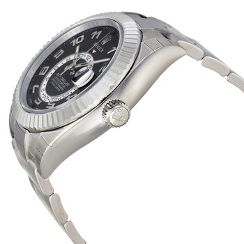 18k white gold case with a white gold-tone 18kt white gold rolex oyster bracelet. Bi-directional rotating ring command 18kt yellow gold bezel. Black dial with silver-tone hands and Roman numeral hour markers. Minute markers around the outer rim. Dial Type: Analog. Luminescent hands. "saros" annual calendar. 24 hour sub-dial subdials. Rolex Calibre 9001 automatic movement with a 72-hour power reserve. Scratch resistant sapphire crystal. Screw down crown. Round case shape. Case size: 42 mm. Oysterlock clasp. Water resistant at 100 meters / 330 feet. Functions: annual calendar, GMT, second time zone, month, date, hour, minute, second, chronometer. Luxury watch style. Watch label: Swiss Made. Rolex Sky Dweller Black Dial 18K White Gold Oyster Bracelet Automatic Men's Watch 326939BKAO.