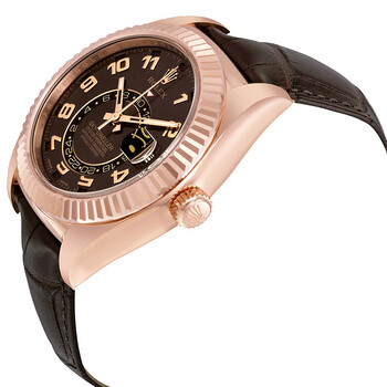 18kt rose gold case with a brown leather strap. Bi-directional rotating fluted ring command 18kt rose gold bezel. Brown dial with luminous rose gold hands and Arabic numeral hour markers. Minute markers around the outer rim. Dial Type: Analog. Luminescent hands. "saros" annual calendar. One subdial displaying: 24 hour. Rolex Calibre 9001 Automatic movement, containing 40 Jewels, composed of 380 parts, bitting at 28800 vph, and has a power reserve of approximately 72 hours. Scratch resistant sapphire crystal. Screw down crown. Solid case back. Round case shape, case size: 42 mm. 18kt rose gold deployment clasp. Water resistant at 100 meters / 330 feet. Functions: annual calendar, GMT, second time zone, month, date, hour, minute, second, chronometer. Sky Dweller Series. Luxury watch style. Watch label: Swiss Made. Item Variations: 326135-STRAP. Rolex Sky Dweller Brown Dial GMT 18k Rose Gold Leather Men's Watch 326135BRAL.