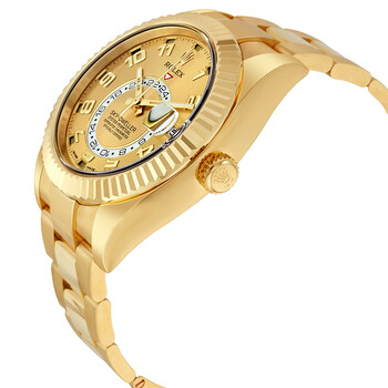 18kt yellow gold case with a 18kt yellow gold rolex oyster bracelet. Bi-directional rotating ring command 18kt yellow gold bezel. Champagne dial with yellow gold-tone hands and Arabic numeral hour markers. Minute markers around the outer rim. Dial Type: Analog. "saros" annual calendar. 24 hour (GMT) sub-dial at the 6 o'clock position subdials. Rolex Calibre 9001 automatic movement with a 72-hour power reserve. Scratch resistant sapphire crystal. Screw down crown. Solid case back. Round case shape. Case size: 42 mm. Oysterlock clasp. Water resistant at 100 meters / 330 feet. Functions: annual calendar, GMT, second time zone, month, date, hour, minute, second, chronometer. Luxury watch style. Watch label: Swiss Made. Item Variations: 326938-72418. Rolex Sky Dweller Champagne Dial 18K Yellow Gold Oyster Bracelet Automatic Men's Watch 326938CAO.