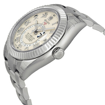 18kt white gold case with a 18kt white gold rolex oyster bracelet. Bi-directional rotating ring command 18kt yellow gold bezel. Ivory dial with luminous silver-tone hands and Roman numeral hour markers. Minute markers around the outer rim. Dial Type: Analog. Luminescent hands and markers. "saros" annual calendar. 24 hour (2nd time zone) rotating disk subdials. Rolex Calibre 9001 automatic movement with a 72-hour power reserve. Scratch resistant sapphire crystal. Screw down crown. Solid case back. Round case shape. Case size: 42 mm. Oysterlock clasp. Water resistant at 100 meters / 330 feet. Functions: annual calendar, GMT, second time zone, month, date, hour, minute, second, chronometer. Luxury watch style. Watch label: Swiss Made. Rolex Sky Dweller Ivory Dial 18K White Gold Oyster Bracelet Automatic Men's Watch 326939IVRO.