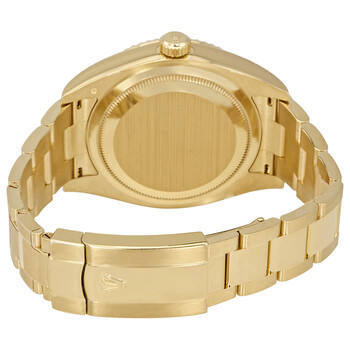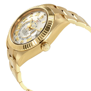 18kt yellow gold case with a 18kt yellow gold rolex oyster bracelet. Bi-directional rotating ring command 18kt yellow gold bezel. Silver dial with gold-tone hands and Roman numeral hour markers. Minute markers around the outer rim. Dial Type: Analog. Luminescent hands and markers. Date display at the 3 o'clock position. One - 24 hour subdial. Rolex Calibre 9001 automatic movement with a 72-hour power reserve. Scratch resistant sapphire crystal. Screw down crown. Solid case back. Round case shape. Case size: 42 mm. Oyster clasp. Water resistant at 100 meters / 330 feet. Functions: annual calendar, GMT, second time zone, month, date, hour, minute, second, chronometer. Additional Info: 24-hour display on off-centre disc, month display via 12 apertures around the circumference of the dial. Luxury watch style. Watch label: Swiss Made. Item Variations: 326938-72418. Rolex Sky Dweller Silver Dial 18kt Yellow Gold Oyster Men's Watch 326938SRO.