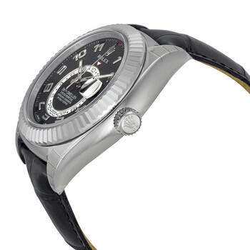 18kt white gold case with a black (alligator) leather strap. Bi-directional rotating ring command 18kt white gold bezel. Black dial with luminous silver-tone hands and Arabic numeral hour markers. Minute markers around the outer rim. Dial Type: Analog. Luminescent hands. Date display at the 3 o'clock position. One subdial displaying: 24 hour. Rolex Calibre 9001 Automatic movement, containing 40 Jewels, composed of 380 parts, bitting at 28800 vph, and has a power reserve of approximately 72 hours. Scratch resistant sapphire crystal. Screw down crown. Solid case back. Round case shape, case size: 42 mm. Oyster clasp. Water resistant at 100 meters / 330 feet. Functions: annual calendar, GMT, second time zone, month, date, hour, minute, second, chronometer. Sky Dweller Series. Luxury watch style. Watch label: Swiss Made. Item Variations: 326139-STRAP. Rolex Sky-Dweller Automatic Black Dial 18kt White Gold Men's Watch 326139BKAL.