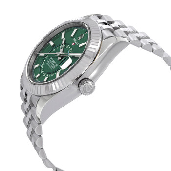 Silver-tone stainless steel case and bracelet. Bi-directional rotating ring command 18kt white gold bezel. Green dial with silver-tone hands and index hour markers. Minute markers around the outer rim. Dial Type: Analog. Luminescent hands and markers. Date display at the 3 o'clock position. One subdial displaying: 24 hour. Rolex Calibre 9002 Automatic movement, based upon Rolex Calibre 9001, containing 40 Jewels, bitting at 28800 vph, and has a power reserve of approximately 72 hours. Scratch resistant sapphire crystal. Screw down crown. Solid case back. Round case shape, case size: 42 mm. Fold over clasp with a safety release. Water resistant at 100 meters / 330 feet. Functions: annual calendar, month, date, GMT, second time zone, hour, minute, second, chronometer. Additional Info: original box, manual (complete accessories). Sky-dweller Series. Luxury watch style. Watch label: Swiss Made. Rolex Sky-Dweller GMT Automatic Chronometer Green Dial Men's Watch 336934-0002.