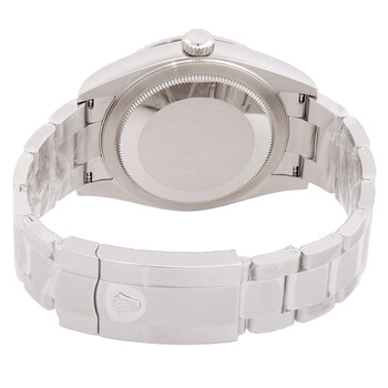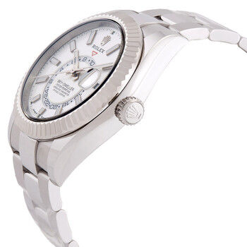 Silver-tone stainless steel case with a silver-tone stainless steel oyster bracelet. Bi-directional rotating ring command 18kt white gold bezel. White dial with silver-tone hands and index hour markers. Minute markers around the outer rim. Dial Type: Analog. Luminescent hands and markers. Date display at the 3 o'clock position. One subdial displaying: 24 hour. Rolex Calibre 9002 Automatic movement, based upon Rolex Calibre 9001, containing 40 Jewels, bitting at 28800 vph, and has a power reserve of approximately 72 hours. Scratch resistant sapphire crystal. Screw down crown. Solid case back. Round case shape, case size: 42 mm. Fold over clasp with a safety release. Water resistant at 100 meters / 330 feet. Functions: annual calendar, month, date, GMT, second time zone, hour, minute, second, chronometer. Additional Info: original box, manual (complete accessories). Sky-dweller Series. Luxury watch style. Watch label: Swiss Made. Rolex Sky-Dweller GMT Automatic Chronometer White Dial Men's Watch 336934-0003.