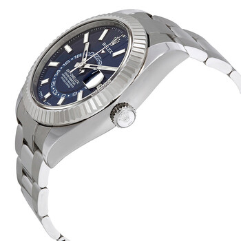 Stainless steel case with a stainless steel Rolex oyster bracelet with 18kt white gold links. Fluted ring command 18kt white gold bezel. Blue dial with luminous silver-tone hands and index hour markers. Minute markers around the outer rim. Dial Type: Analog. Luminescent hands and markers. Date display at the 3 o'clock position. 24 hour sub-dial. Rolex calibre 9001 automatic movement, containing 40 Jewels, composed of 380 parts, bitting at 28800 vph, and has a power reserve of approximately 72 hours. Scratch resistant sapphire crystal. Screw down crown. Solid case back. Round case shape. Case size: 42 mm. Oysterlock clasp. Water resistant at 100 meters / 330 feet. Functions: annual calendar, month, date, GMT, second time zone, hour, minute, second, chronometer. Sky-dweller Series. Luxury watch style. Watch label: Swiss Made. Rolex Sky-Dweller Oyster Automatic Blue Dial Men's Watch 326934BLSO.