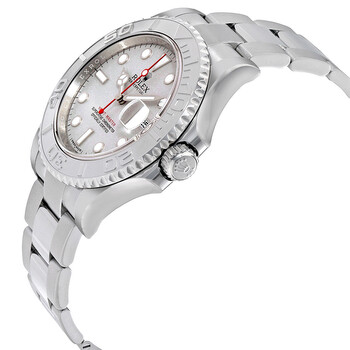 Rolesium (combination steel and platinum) case with a silver-tone stainless steel rolex oyster bracelet. Bi-directional rotating time-lapse white platinum bezel. Platinum dial with luminous silver-tone Mercedes-logo, sword, and Breguet-style shape hands and dot hour markers. Minute markers around the outer rim. Dial Type: Analog. Luminescent hands and markers. Date display at the 3 o'clock position. Rolex Calibre 3135 automatic movement with a 50-hour power reserve. Scratch resistant sapphire crystal. Screw down crown. Solid case back. Round case shape. Case size: 40 mm. Oysterlock clasp. Water resistant at 100 meters / 330 feet. Functions: date, hour, minute, second, chronometer. Luxury watch style. Watch label: Swiss Made. Rolex Yacht-Master 40 Platinum Dial Stainless Steel Oyster Bracelet Automatic Men's Watch 116622PLSO.
