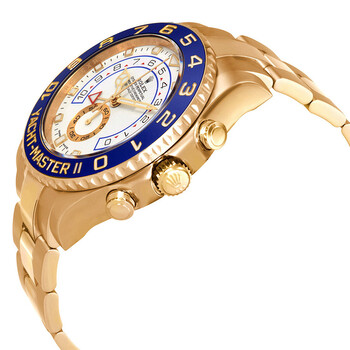 18kt yellow gold case with a 18kt yellow gold rolex oyster bracelet. Bi-directional rotating ring command 18kt yellow gold bezel with a blue top ring. White dial with luminous yellow gold-tone Mercedes-logo, sword shape hands and index hour markers. Yacht race markers. minute markers around the outer rim. Dial Type: Analog. Luminescent hands. One subdial displaying: small second. Rolex Calibre 4161 Automatic movement, based upon Rolex 4160, containing 48 Jewels, composed of 360 parts, bitting at 28800 vph, and has a power reserve of approximately 72 hours. Scratch resistant sapphire crystal. Screw down crown. Solid case back. Round case shape, case size: 44 mm. Oysterlock clasp. Water resistant at 100 meters / 330 feet. Functions: hour, minute, second, countdown. Yacht-master II Series. Luxury watch style. Watch label: Swiss Made. Rolex Yacht-Master II Automatic White Dial Men's 18kt Yellow Gold Oyster Watch 116688-0002.