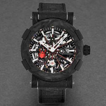 Black fiber case with a black nylon strap. Fixed black fiber bezel. Black dial with silver-tone hands and index hour markers. Minute markers around the outer rim. Dial Type: Analog. Luminescent hands and markers. RJ-3005 automatic movement. Scratch resistant sapphire crystal. Screw down crown. Transparent case back. Round case shape, case size: 45 mm, case thickness: 15 mm. Band length: 8 inches. Deployment with push button release clasp. Water resistant at 100 meters / 330 feet. Functions: hour, minute, second. Arraw Series. Luxury watch style. Watch label: Swiss Made. Romain Jerome Arraw Automatic Black Dial Men's Watch 1C45S.BBBR.1023.PR.SPM19.
