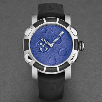 Silver-tone stainless steel case with a black rubber strap. Fixed black stainless steel bezel. Blue dial with silver-tone hands. Dial Type: Analog. Romain Jerome Calibre RJ2901 automatic movement. Scratch resistant sapphire crystal. Pull / push crown. Solid case back. Round case shape, case size: 46 mm, case thickness: 16.5 mm. Band width: 22 mm, band length: 8 inches. Deployment with push button release clasp. Water resistant at 30 meters / 100 feet. Functions: hour, minute, second. Additional Info: mechanical self-winding movement, 28'800 vph. Moon Dust Series. Luxury watch style. Romain Jerome Moon dust Automatic Blue Dial Men's Watch RJMDAU.501.10.