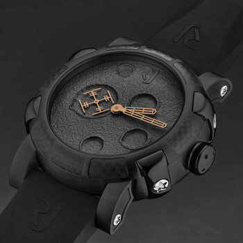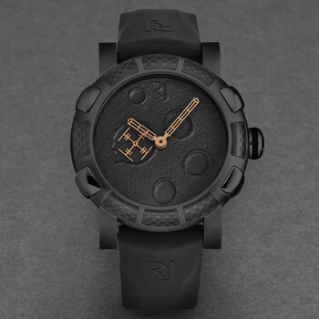 Black stainless steel case with a black rubber strap. Fixed black carbon fiber bezel. Black dial with gold-tone hands. Dial Type: Analog. RJ2901 – Mechanical self-winding movement, 28'800 vph automatic movement. Scratch resistant sapphire crystal. Pull / push crown. Solid case back. Round case shape, case size: 46 mm, case thickness: 16.5 mm. Band width: 22 mm, band length: 8 inches. Tang clasp. Water resistant at 30 meters / 100 feet. Functions: hour, minute, second. Additional Info: hours, minutes, small seconds. Moon Dust Series. Luxury watch style. Romain Jerome Moon Dust Black Dial Men's Watch RJ.MD.AU.103.20.