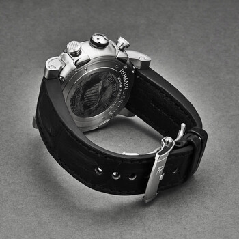 Silver-tone stainless steel case with a black leather strap. Fixed silver-tone carbon fiber bezel. Black dial with silver-tone hands. Dial Type: Analog. Luminescent hands and markers. RJ7753 automatic movement. Scratch resistant sapphire crystal. Solid case back. Round case shape, case size: 46 mm. Deployment with push button release clasp. Water resistant at 30 meters / 100 feet. Functions: chronograph, hour, minute, second. Additional Info: mechanical automatic-winding chronograph movement. Moon Dust-dna Series. Luxury watch style. Watch label: Swiss Made. Romain Jerome Moon Dust-Dna Chronograph Automatic Black Dial Men's Watch RJ.MD.CH.101.10.