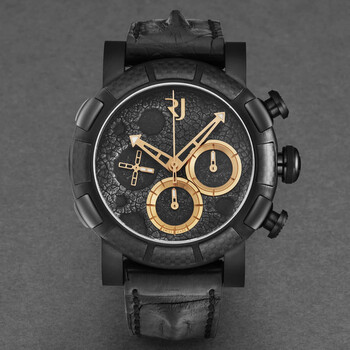 Black stainless steel case with a black leather strap. Fixed black carbon fiber bezel. Black dial with gold-tone hands. Dial Type: Analog. Luminescent hands. RJ7753 automatic movement. Scratch resistant sapphire crystal. Solid case back. Round case shape, case size: 46 mm. Deployment with push button release clasp. Water resistant at 30 meters / 100 feet. Functions: chronograph, hour, minute, second. Additional Info: mechanical automatic-winding chronograph movement. Moon Dust-dna Series. Luxury watch style. Watch label: Swiss Made. Romain Jerome Moon Dust-Dna Chronograph Automatic Black Dial Men's Watch RJ.MD.CH.103.20.