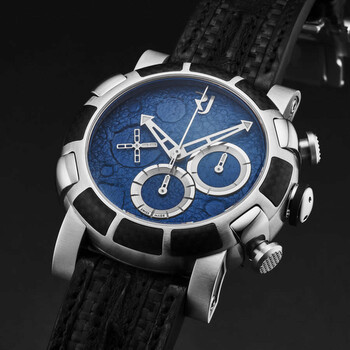 Silver-tone stainless steel case with a black leather strap. Fixed silver-tone carbon fiber bezel. Blue dial with silver-tone hands. Dial Type: Analog. Luminescent hands. RJ7753 automatic movement. Scratch resistant sapphire crystal. Round case shape, case size: 46 mm. Deployment with push button release clasp. Water resistant at 30 meters / 100 feet. Functions: chronograph, hour, minute, second. Additional Info: mechanical automatic-winding chronograph movement. Moon Dust-dna Series. Luxury watch style. Watch label: Swiss Made. Romain Jerome Moon Dust-Dna Chronograph Automatic Blue Dial Men's Watch RJ.MD.CH.501.10.