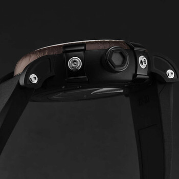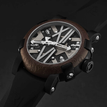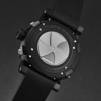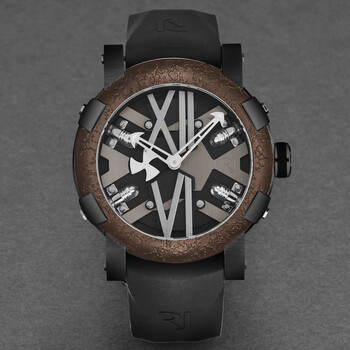 Black stainless steel case with a black rubber strap. Fixed brown stainless steel bezel. Black dial with silver-tone hands. Dial Type: Analog. Luminescent hands. RJ2901 automatic movement. Scratch resistant sapphire crystal. Pull / push crown. Solid case back. Round case shape, case size: 46 mm, case thickness: 14.5 mm. Band width: 22 mm, band length: 8 inches. Fold over clasp with a safety release. Water resistant at 30 meters / 100 feet. Functions: hour, minute. Additional Info: 28'800 vph. Steampunk Series. Luxury watch style. Romain Jerome Steampunk Automatic Black Dial Men's Watch RJ.ST.AU.101.20.