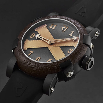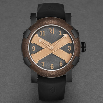 Black stainless steel case with a black rubber strap. Fixed brown stainless steel bezel. Grey dial with rose gold-tone hands and Arabic numeral hour markers. Dial Type: Analog. RJ2001 - Mechanical self-winding movement - 28,800 vph automatic movement. Scratch resistant sapphire crystal. Pull / push crown. Solid case back. Round case shape, case size: 46 mm, case thickness: 14.5 mm. Band width: 22 mm, band length: 8 inches. Tang clasp. Water resistant at 30 meters / 100 feet. Functions: hour, minute. Titanclagrnd Series. Luxury watch style. Romain Jerome Titanclagrnd Automatic Grey Dial Men's Watch RJ.TG.AU.403.20.