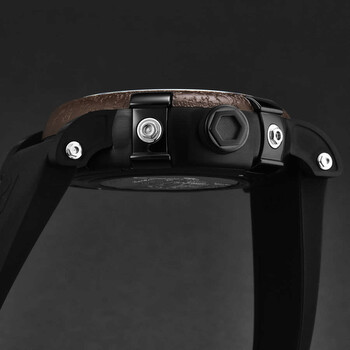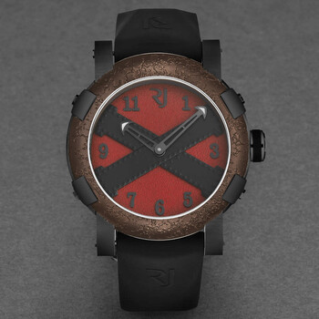 Black stainless steel case with a black rubber strap. Fixed brown stainless steel bezel. Red dial with black hands and Arabic numeral hour markers. Dial Type: Analog. RJ2001 automatic movement. Scratch resistant sapphire crystal. Pull / push crown. Solid case back. Round case shape, case size: 46 mm, case thickness: 14.5 mm. Band width: 22 mm, band length: 8 inches. Tang clasp. Water resistant at 30 meters / 100 feet. Functions: hour, minute. Additional Info: mechanical self-winding movement - 28,800 vph. Titanclagrnd Series. Luxury watch style. Romain Jerome Titanclagrnd Automatic Red Dial Men's Watch RJ.TG.AU.702.20.