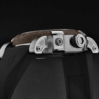 Silver-tone stainless steel case with a black rubber strap. Fixed brown stainless steel bezel. Brown dial with silver-tone hands and Arabic numeral hour markers. Dial Type: Analog. Romain Jerome Calibre RJ2001 automatic movement. Scratch resistant sapphire crystal. Pull / push crown. Solid case back. Round case shape, case size: 46 mm, case thickness: 14.5 mm. Band width: 22 mm, band length: 8 inches. Tang clasp. Water resistant at 30 meters / 100 feet. Functions: hour, minute. Additional Info: mechanical self-winding movement - 28,800 vph. Titanic A La Grande Series. Luxury watch style. Romain Jerome Titanic A La Grande Automatic Brown Dial Men's Watch RJ.TG.AU.301.10.