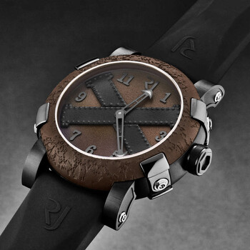 Black stainless steel case with a black rubber strap. Fixed brown stainless steel bezel. Brown dial with black hands and Arabic numeral hour markers. Dial Type: Analog. RJ2001 automatic movement. Scratch resistant sapphire crystal. Pull / push crown. Solid case back. Round case shape, case size: 46 mm, case thickness: 14.5 mm. Band width: 22 mm, band length: 8 inches. Fold over clasp with a safety release. Water resistant at 30 meters / 100 feet. Functions: hour, minute. Additional Info: mechanical self-winding movement - 28,800 vph. Titanic A La Grande Series. Luxury watch style. Romain Jerome Titanic A La Grande Automatic Brown Dial Men's Watch RJ.TG.AU.302.20.