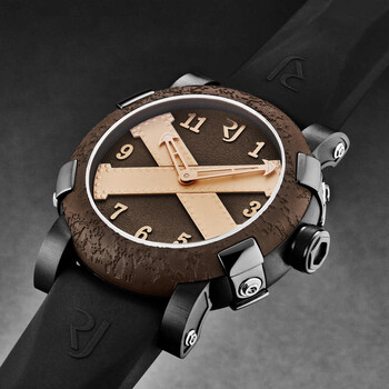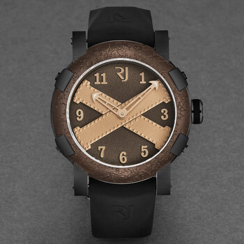 Black stainless steel case with a black rubber strap. Fixed brown stainless steel bezel. Brown dial with gold-tone hands and Arabic numeral hour markers. Dial Type: Analog. Luminescent hands. RJ2001 automatic movement. Scratch resistant sapphire crystal. Pull / push crown. Solid case back. Round case shape, case size: 46 mm, case thickness: 14.5 mm. Band width: 22 mm, band length: 8 inches. Deployment with push button release clasp. Water resistant at 30 meters / 100 feet. Functions: hour, minute. Additional Info: mechanical self-winding movement - 28,800 vph. Titanic A La Grande Series. Luxury watch style. Romain Jerome Titanic A La Grande Automatic Brown Dial Men's Watch RJ.TG.AU.303.20.