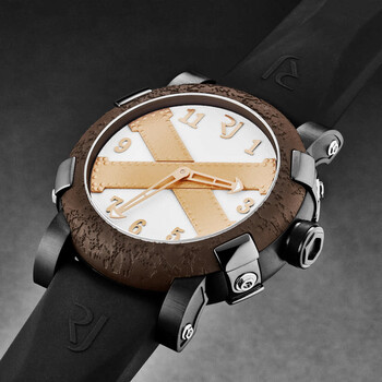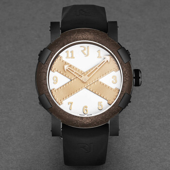 Black stainless steel case with a black rubber strap. Fixed brown stainless steel bezel. White dial with gold-tone hands and Arabic numeral hour markers. Dial Type: Analog. RJ2001 automatic movement. Scratch resistant sapphire crystal. Pull / push crown. Solid case back. Round case shape, case size: 46 mm, case thickness: 14.5 mm. Band width: 22 mm, band length: 8 inches. Fold over clasp with a safety release. Water resistant at 30 meters / 100 feet. Functions: hour, minute. Additional Info: mechanical self-winding movement - 28,800 vph. Titanic A La Grande Series. Luxury watch style. Romain Jerome Titanic A La Grande Automatic White Dial Men's Watch RJ.TG.AU.203.20.