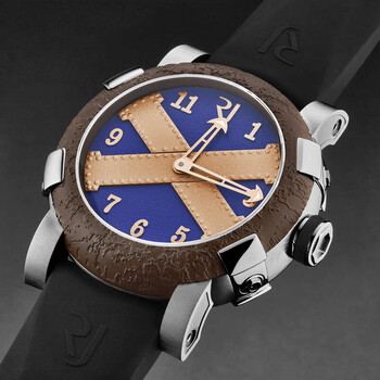 Silver-tone stainless steel case with a black rubber strap. Fixed brown stainless steel bezel. Blue dial with rose gold-tone hands and Arabic numeral hour markers. Dial Type: Analog. RJ2001 - Mechanical self-winding movement - 28,800 vph automatic movement. Scratch resistant sapphire crystal. Pull / push crown. Solid case back. Round case shape, case size: 46 mm, case thickness: 14.5 mm. Band width: 22 mm, band length: 8 inches. Tang clasp. Water resistant at 30 meters / 100 feet. Functions: hour, minute. Additional Info: hours, minutes. Titanic A La Grande Series. Luxury watch style. Romain Jerome Titanic A La Grande Blue Dial Men's Watch RJ.TG.AU.503.10.