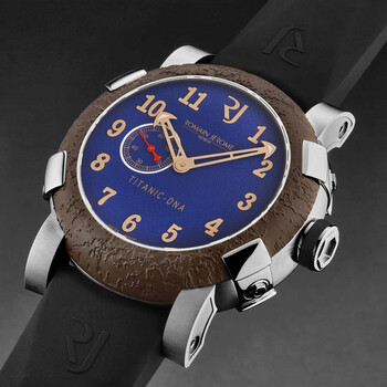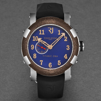 Silver-tone stainless steel case with a black rubber strap. Fixed brown stainless steel bezel. Blue dial with rose gold-tone hands and Arabic numeral hour markers. Dial Type: Analog. Luminescent hands. Romain Jerome Calibre RJ2901 automatic movement. Scratch resistant sapphire crystal. Pull / push crown. Solid case back. Round case shape, case size: 46 mm, case thickness: 14.5 mm. Band width: 22 mm, band length: 8 inches. Deployment with push button release clasp. Water resistant at 30 meters / 100 feet. Functions: hour, minute, second. Additional Info: mechanical self-winding movement, 28'800 vph. Titanic Series. Luxury watch style. Romain Jerome Titanic Automatic Blue Dial Men's Watch RJTIAU.503.10.