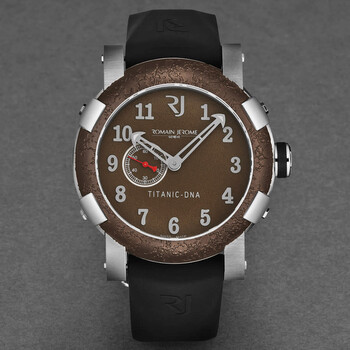 Silver-tone stainless steel case with a black rubber strap. Fixed brown stainless steel bezel. Brown dial with silver-tone hands and Arabic numeral hour markers. Dial Type: Analog. Luminescent hands. Romain Jerome Calibre RJ2901 automatic movement. Scratch resistant sapphire crystal. Pull / push crown. Solid case back. Round case shape, case size: 46 mm, case thickness: 14.5 mm. Band width: 22 mm, band length: 8 inches. Deployment with push button release clasp. Water resistant at 30 meters / 100 feet. Functions: hour, minute, second. Additional Info: mechanical self-winding movement, 28'800 vph. Titanic Series. Luxury watch style. Romain Jerome Titanic Automatic Brown Dial Men's Watch RJTIAU.301.10.