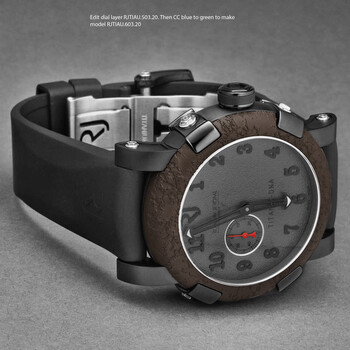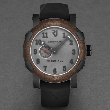 Black stainless steel case with a black rubber strap. Fixed brown stainless steel bezel. Grey dial with black hands and Arabic numeral hour markers. Dial Type: Analog. Luminescent hands. Romain Jerome Calibre RJ2901 automatic movement. Scratch resistant sapphire crystal. Pull / push crown. Solid case back. Round case shape, case size: 46 mm, case thickness: 15 mm. Band width: 22 mm, band length: 8 inches. Deployment with push button release clasp. Water resistant at 30 meters / 100 feet. Functions: hour, minute, second. Additional Info: mechanical self-winding movement, 28'800 vph. Titanic Series. Luxury watch style. Romain Jerome Titanic Automatic Grey Dial Men's Watch RJTIAU.402.20.
