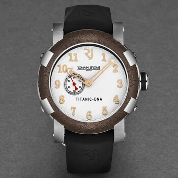 Silver-tone stainless steel case with a black rubber strap. Fixed brown bezel. White dial with gold-tone hands and Arabic numeral hour markers. Dial Type: Analog. Luminescent hands. Romain Jerome calibre C22RJ51 automatic movement. Scratch resistant sapphire crystal. Pull / push crown. Solid case back. Round case shape, case size: 46 mm, case thickness: 14.5 mm. Band width: 22 mm, band length: 8 inches. Deployment with push button release clasp. Water resistant at 30 meters / 100 feet. Functions: hour, minute, second. Additional Info: hours, minutes, small seconds. Titanic Series. Luxury watch style. Watch label: Swiss Made. Romain Jerome Titanic Automatic White Dial Men's Watch RJ.TI.AU.203.10.