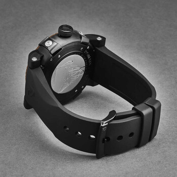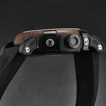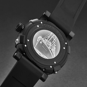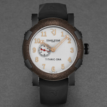 Black stainless steel case with a black rubber strap. Fixed brown bezel. White dial with rose gold-tone hands and Arabic numeral hour markers. Dial Type: Analog. Luminescent hands. RJ2901 – Mechanical self-winding movement - 28,800 vph automatic movement. Scratch resistant sapphire crystal. Pull / push crown. Solid case back. Round case shape, case size: 46 mm, case thickness: 14.5 mm. Band width: 22 mm, band length: 8 inches. Buckle clasp. Water resistant at 30 meters / 100 feet. Functions: hour, minute, second. Titanic Series. Luxury watch style. Romain Jerome Titanic Automatic White Dial Men's Watch RJ.TI.AU.203.20.
