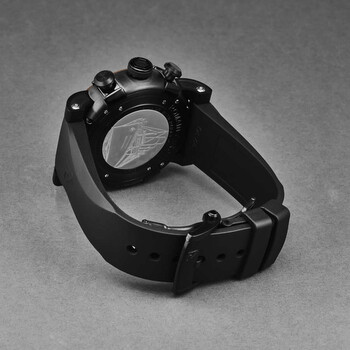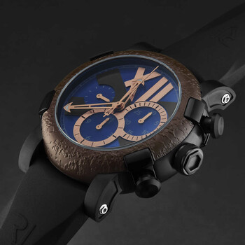 Black stainless steel case with a black rubber strap. Fixed brown stainless steel bezel. Blue dial with rose gold-tone hands. Dial Type: Analog. Luminescent hands. RJ7753 automatic movement. Scratch resistant sapphire crystal. Pull / push crown. Solid case back. Round case shape, case size: 46 mm, case thickness: 14.5 mm. Band width: 22 mm, band length: 8 inches. Deployment with push button release clasp. Water resistant at 30 meters / 100 feet. Functions: chronograph, hour, minute, second. Titanic-dna Series. Luxury watch style. Romain Jerome Titanic-Dna Chronograph Automatic Blue Dial Men's Watch RJ.TI.CH.503.20.