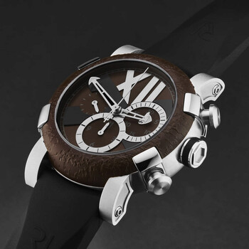 Silver-tone stainless steel case with a black rubber strap. Fixed brown stainless steel bezel. Brown dial with silver-tone hands. Dial Type: Analog. Luminescent hands. RJ7753 automatic movement. Scratch resistant sapphire crystal. Pull / push crown. Solid case back. Round case shape, case size: 46 mm, case thickness: 14.5 mm. Band width: 22 mm, band length: 8 inches. Deployment with push button release clasp. Water resistant at 30 meters / 100 feet. Functions: chronograph, hour, minute, second. Titanic-dna Series. Luxury watch style. Romain Jerome Titanic-Dna Chronograph Automatic Brown Dial Men's Watch RJ.TI.CH.301.10.