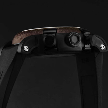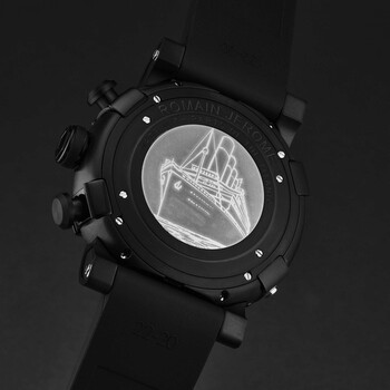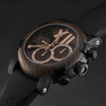 Black stainless steel case with a black rubber strap. Fixed brown stainless steel bezel. Brown dial with rose gold-tone hands. Dial Type: Analog. Luminescent hands. RJ7753 automatic movement. Scratch resistant sapphire crystal. Pull / push crown. Solid case back. Round case shape, case size: 46 mm, case thickness: 14.5 mm. Band width: 22 mm, band length: 8 inches. Deployment with push button release clasp. Water resistant at 30 meters / 100 feet. Functions: chronograph, hour, minute, second. Titanic-dna Series. Luxury watch style. Romain Jerome Titanic-Dna Chronograph Automatic Brown Dial Men's Watch RJ.TI.CH.303.20.