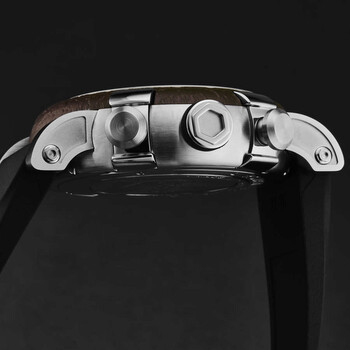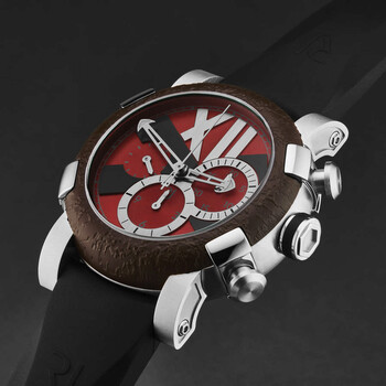 Silver-tone stainless steel case with a black rubber strap. Fixed brown stainless steel bezel. Red dial with silver-tone hands. Dial Type: Analog. Luminescent hands. RJ7753 automatic movement. Scratch resistant sapphire crystal. Pull / push crown. Solid case back. Round case shape, case size: 46 mm, case thickness: 14.5 mm. Band width: 22 mm, band length: 8 inches. Deployment with push button release clasp. Water resistant at 30 meters / 100 feet. Functions: chronograph, hour, minute, second. Titanic-dna Series. Luxury watch style. Romain Jerome Titanic-Dna Chronograph Automatic Red Dial Men's Watch RJ.TI.CH.701.10.