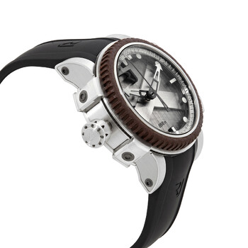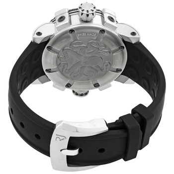 Stainless steel case with a black rubber (octopus suction-cup interior) strap. Fixed stainless steel bezel with an inlaid rusted titanic steel inlay. Silver textured dial with silver-tone skeleton hands and dot hour markers. Arabic numeral minute markers (at 5 minute intervals). Minute markers around the outer rim. Dial Type: Analog. Luminescent hands and markers. Calibre RJ002-A2 automatic movement with a 42-hour power reserve. Scratch resistant sapphire crystal. Screw down crown. Solid hand engraved with octopus design case back. Round case shape. Case size: 46 mm. Deployment with push button release clasp. Water resistant at 270 meters / 888 feet. Functions: hour, minute, second. Titanic-dna Metal Octopus Series. Luxury watch style. Watch label: Swiss Made. Item Variations: RJ T AU DI 003 01, RJ-T-AU-DI-003-01, RJ/T/AU/DI/003/01, RJTAUDI00301. Romain Jerome Titanic-DNA Metal Octopus Men's Watch RJ.T.AU.DI.003.01.