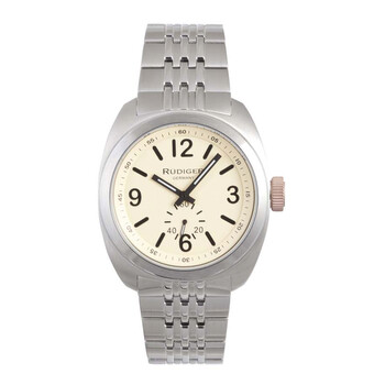 Silver-tone stainless steel case with a silver stainless steel bracelet. Fixed silver-tone stainless steel bezel. with black hands and index and Arabic numeral hour markers. Minute markers around the outer rim. Dial Type: Analog. One - 60 seconds subdial. Quartz movement. Scratch resistant mineral crystal. Push/pull crown. Solid case back. Round case shape, case size: 44 mm, case thickness: 11 mm. Band width: 23 mm, band length: 8.5 in. Deployant buckle clasp. Water resistant at 100 meters / 330 feet. Functions: hour, minute, second. Casual watch style. Rudiger Siegen Men's Watch R5001-04-013.7.
