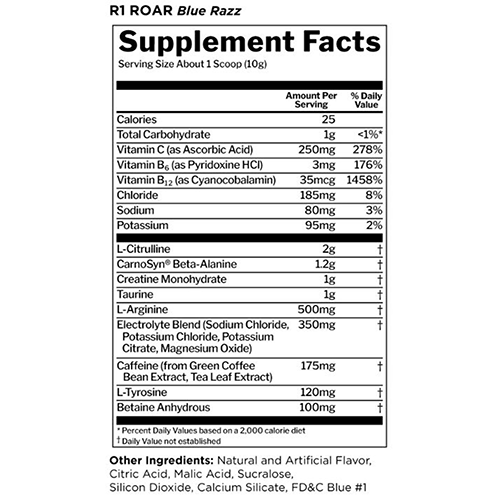 Rule 1 ROAR არის ენერგიისა და ფოკუსის მხარდამჭერი პრე-ვორკაუთი, რომელიც აერთიანებს L-ციტრულინს, CarnoSyn® ბეტა-ალანინს, კრეატინ მონოჰიდრატს, ტაურინს, არგინინს, 175 მგ კოფეინის ნაზავს (მწვანე ყავა/ჩაის ექსტრაქტები) და ელექტროლიტებს (350 მგ). ეხმარება ენერგიის მაღალ დონეს, „ფამფის“ შეგრძნებასა და ჰიდრატაციას ინტენსიური ვარჯიშისას. არ შეიცავს შაქარს.
