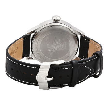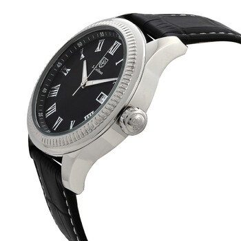 Silver-tone stainless steel case with a black leather strap. Fixed silver-tone stainless steel bezel. Black dial with silver-tone hands and Roman numeral hour markers. Minute markers around the outer rim. Dial Type: Analog. Luminescent hands. Date display at the 3 o'clock position. SII Caliber VJ42 quartz movement. Scratch resistant flame fusion crystal. Pull / push crown. Solid case back. Round case shape, case size: 44 mm, case thickness: 12 mm. Band width: 22 mm, band length: 8.5 inches. Buckle clasp. Water resistant at 50 meters / 165 feet. Functions: date, hour, minute, second. Casual watch style. Watch label: Japan Movt. S Coifman Heritage Black Dial Men's Watch SC0392.