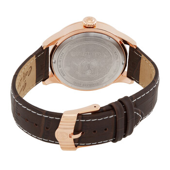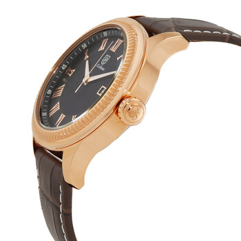 Rose gold-tone stainless steel case with a brown leather strap. Fixed rose gold-tone stainless steel bezel. Black dial with rose gold-tone hands and Roman numeral hour markers. Minute markers around the outer rim. Dial Type: Analog. Luminescent hands. Date display at the 3 o'clock position. SII Caliber VJ42 quartz movement. Scratch resistant flame fusion crystal. Pull / push crown. Solid case back. Round case shape, case size: 44 mm, case thickness: 12 mm. Band width: 22 mm, band length: 8.5 inches. Buckle clasp. Water resistant at 50 meters / 165 feet. Functions: date, hour, minute, second. Casual watch style. Watch label: Japan Movt. S Coifman Heritage Black Dial Men's Watch SC0394.