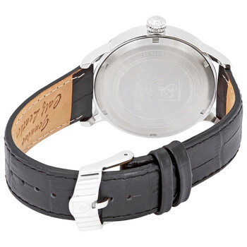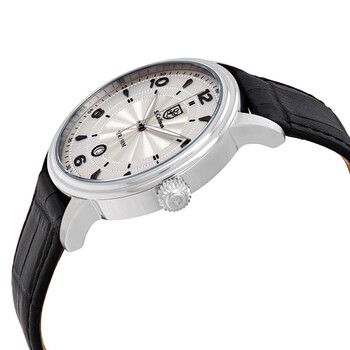 Silver-tone stainless steel case with a black leather strap. Fixed silver-tone stainless steel bezel. White dial with silver-tone hands and Arabic numeral and index hour markers. Minute markers around the outer rim. Dial Type: Analog. Luminescent hands. Date display at the 6 o'clock position. ISA Caliber 2331F quartz movement. Scratch resistant flame fusion crystal. Pull / push crown. Solid case back. Round case shape. Case size: 44 mm. Band width: 22 mm, band length: 8.5 inches. Buckle clasp. Water resistant at 50 meters / 165 feet. Functions: date, hour, minute, second. Casual watch style. S Coifman White Dial Men's Watch SC0374.